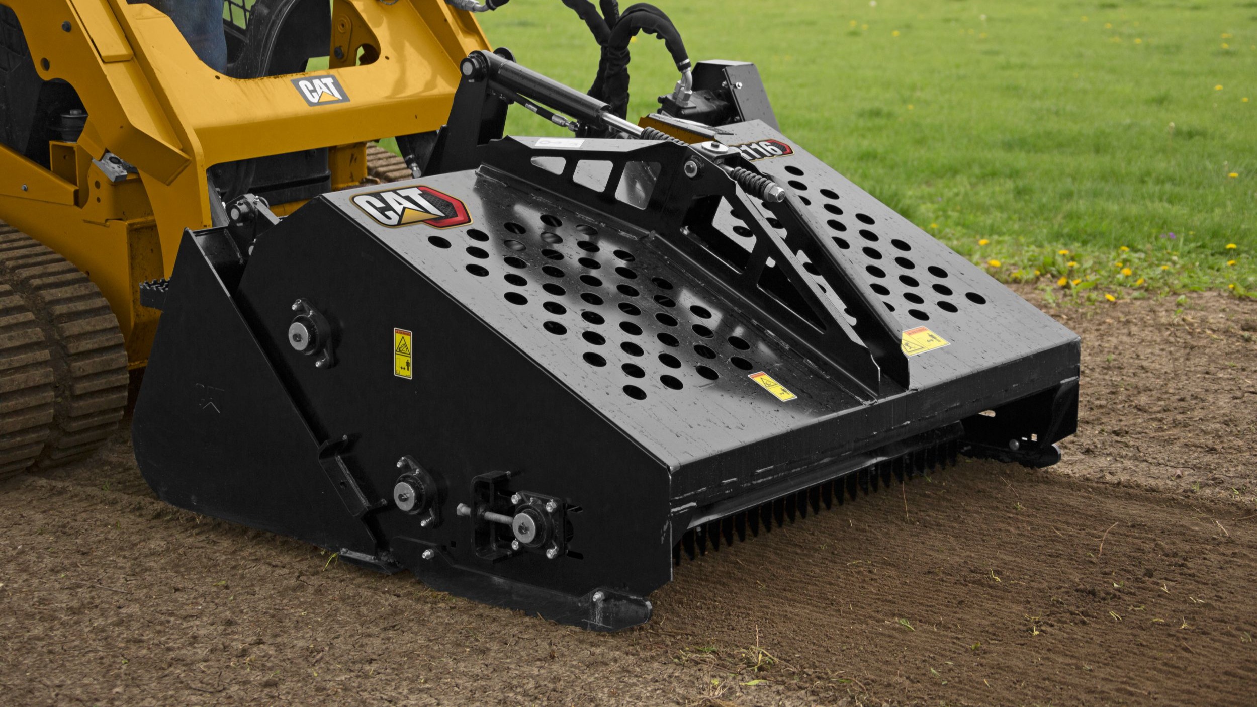 Cat® Landscape Rakes are ideal for residential, commercial, agricultural, building construction, lawn care and golf course maintenance applications. They use the scarifying action of the hardened teeth to pulverize, aerate, level and condition the soil, while collecting and depositing rock and debris in the integrated hopper bucket for quick removal.